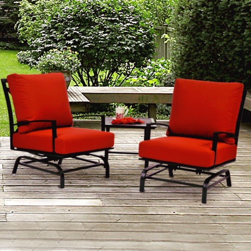 San Michelle cast aluminum outdoor club glider set includes two glider chairs with cushions and one square end table. Contemporary design cast aluminum furniture collection. Strong cast and tubular frames come with five inch Sunbrella seat cushions. All corners are welded 360° for maximum strength and powder coated so it won't chip, fade, or scratch. Perfect for outdoors. Color: Charcoal Gray. Cushions are made of Sunbrella fabric and available in multiple colors. Cushion included in price.