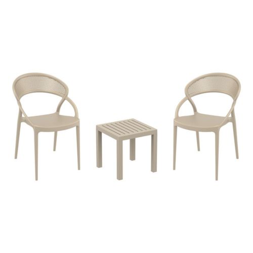 Sunset chairs and Ocean side table 3 piece conversation set in taupe is stylish and comfortable set for your small outdoor space! Made from durable and weather-resistant polypropylene resin, this set is perfect for balconies, terraces, decks, rooftops and patios. Sunset chairs feature a comfortable seat and backrest, making them the perfect choice for relaxing with a good book or enjoying a drink with a loved one. Two people can easily enjoy a refreshing drink together at Ocean side table.