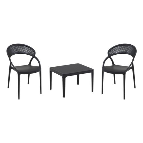 Sunset chairs and Sky 24" side table 3 piece conversation set in black is stylish and comfortable set for your small outdoor space! Made from durable and weather-resistant polypropylene resin, this set is perfect for balconies, terraces, decks, rooftops and patios. Sunset chairs feature a comfortable seat and backrest, making them the perfect choice for relaxing with a good book or enjoying a drink with a loved one. Two people can easily enjoy a refreshing drink together at Sky 24" side table.