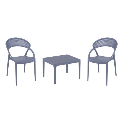 Sunset chairs and Sky 24" side table 3 piece conversation set in dark gray is stylish and comfortable set for your small outdoor space! Made from durable and weather-resistant polypropylene resin, this set is perfect for balconies, terraces, decks, rooftops and patios. Sunset chairs feature a comfortable seat and backrest, making them the perfect choice for relaxing with a good book or enjoying a drink with a loved one. Two people can easily enjoy a refreshing drink together at Sky 24" side table.