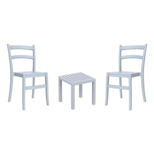 Tiffany chairs and Ocean side table 3 piece conversation set in silver gray is stylish and comfortable set for your small outdoor space! Made from durable and weather-resistant polypropylene resin, this set is perfect for balconies, terraces, decks, rooftops and patios. Tiffany chairs feature a comfortable seat and backrest, making them the perfect choice for relaxing with a good book or enjoying a drink with a loved one. Two people can easily enjoy a refreshing drink together at Ocean side table.