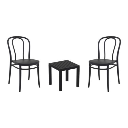 Victor chairs and Ocean side table 3 piece conversation set in black is stylish and comfortable set for your small outdoor space! Made from durable and weather-resistant polypropylene resin, this set is perfect for balconies, terraces, decks, rooftops and patios. Victor chairs feature a comfortable seat and backrest, making them the perfect choice for relaxing with a good book or enjoying a drink with a loved one. Two people can easily enjoy a refreshing drink together at Ocean side table.