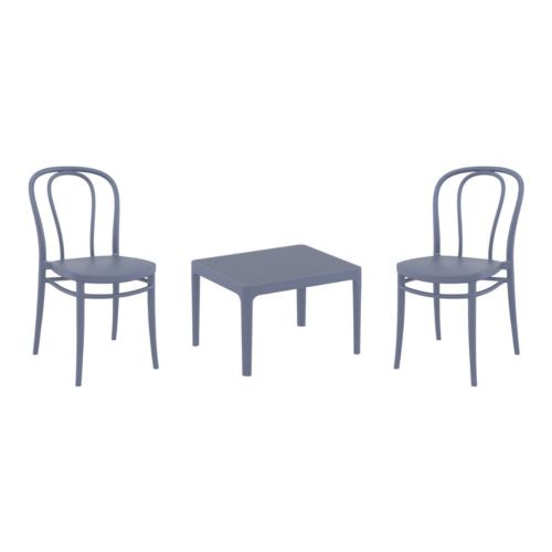 Victor chairs and Sky 24" side table 3 piece conversation set in dark gray is stylish and comfortable set for your small outdoor space! Made from durable and weather-resistant polypropylene resin, this set is perfect for balconies, terraces, decks, rooftops and patios. Victor chairs feature a comfortable seat and backrest, making them the perfect choice for relaxing with a good book or enjoying a drink with a loved one. Two people can easily enjoy a refreshing drink together at Sky 24" side table.