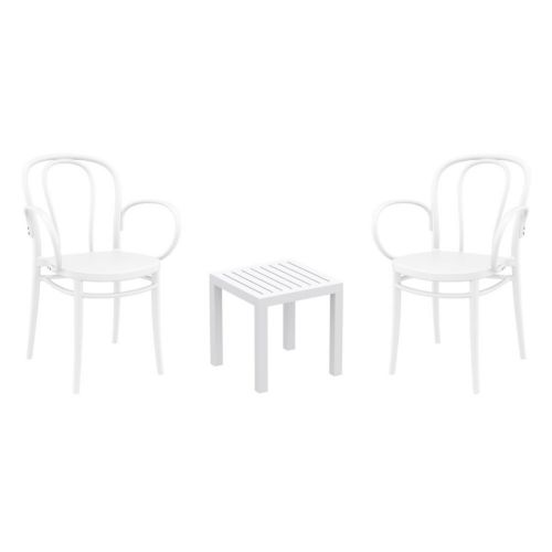 Victor XL arm chairs and Ocean side table 3 piece conversation set in white is stylish and comfortable set for your small outdoor space! Made from durable and weather-resistant polypropylene resin, this set is perfect for balconies, terraces, decks, rooftops and patios. Victor XL arm chairs feature a comfortable seat and backrest, making them the perfect choice for relaxing with a good book or enjoying a drink with a loved one. Two people can easily enjoy a refreshing drink together at Ocean side table.