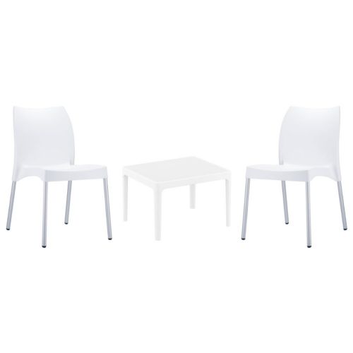 Vita chairs and Sky 24" side table 3 piece conversation set in white is stylish and comfortable set for your small outdoor space! Made from durable and weather-resistant polypropylene resin, this set is perfect for balconies, terraces, decks, rooftops and patios. Vita chairs feature a comfortable seat and backrest, making them the perfect choice for relaxing with a good book or enjoying a drink with a loved one. Two people can easily enjoy a refreshing drink together at Sky 24" side table.