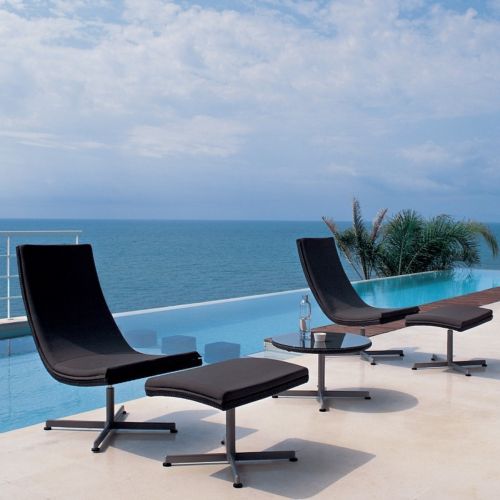 XXL all weather wicker outdoor lounge set with lobby chairs. Set includes two lobby lounging chairs, two footstools and a 27 inch round side table. Contemporary and modern outdoor design. Chairs have a unique hydrolic suspension and swivel. Aluminum structure is woven with synthetic outdoor wicker. Strong but light aluminum frames. Cushions are made from outdoor resistant Sunbrella fabric. Great for all outdoor areas. Wicker available in natural and etna. Cushions available in natural or chocolate brown.