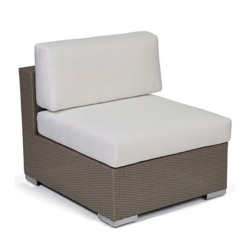 10Tierra wicker deep seating sectional middle module. Contemporary patio furniture design. Made from all weather outdoor wicker over strong powder coated aluminum frame. Maintenance free. Can be washed down with water. Totally outdoor resistant. Cushions are made from 100% Sunbrella fabric and durable for outdoor use. Seat and back cushions included. Wicker available in Moccachino only. Cushions are 5 inch thick. Sunbrella fabric is available in multiple colors and patterns.