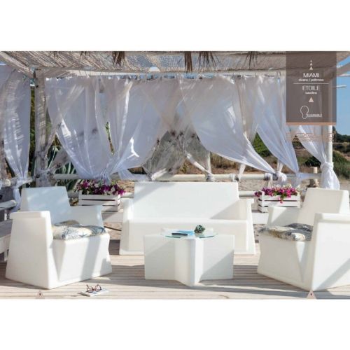 Miami deep seating set with one loveseat, two club chairs, and one coffee table. Modern European design meets functionality. Set items are made with polypropylene and perfect for pool side and outdoor applications. All items are 100% made for outdoor resistance. Great for contemporary settings. Table has a glass top.