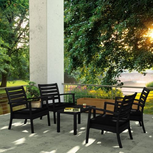 Artemis XL outdoor seating set of four black club arm chairs with black cushions and one rectangle coffee table. Modern design with simple lines. Made from commercial grade polypropylene. Club chairs stack. Casual and modern design make it suitable for indoors and outdoors. Polypropylene fame resists sun, oils, chlorine and all outdoor conditions. Great casual seating choice for outdoor areas. Chairs certified for strict European standards by CATAS Italian research institute and test laboratory.