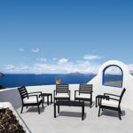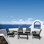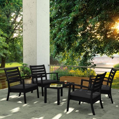 Artemis XL outdoor seating set of four black club arm chairs with charcoal cushions and one rectangle coffee table. Modern design with simple lines. Made from commercial grade polypropylene. Club chairs stack. Casual and modern design make it suitable for indoors and outdoors. Polypropylene fame resists sun, oils, chlorine and all outdoor conditions. Great casual seating choice for outdoor areas. Chairs certified for strict European standards by CATAS Italian research institute and test laboratory.