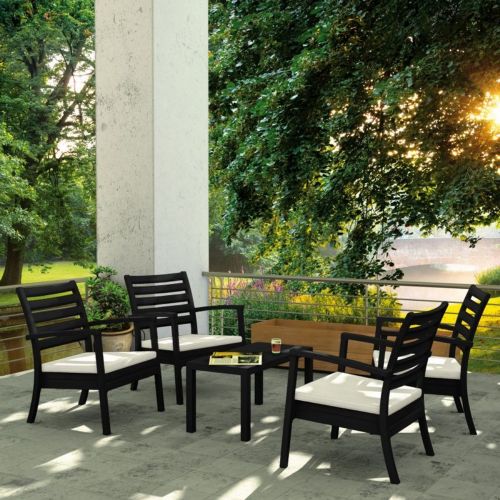 Artemis XL outdoor seating set of four black club arm chairs with natural cushions and one rectangle coffee table. Modern design with simple lines. Made from commercial grade polypropylene. Club chairs stack. Casual and modern design make it suitable for indoors and outdoors. Polypropylene fame resists sun, oils, chlorine and all outdoor conditions. Great casual seating choice for outdoor areas. Chairs certified for strict European standards by CATAS Italian research institute and test laboratory.
