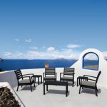 Artemis XL outdoor seating set of four black club arm chairs with taupe cushions and one rectangle coffee table. Modern design with simple lines. Made from commercial grade polypropylene. Club chairs stack. Casual and modern design make it suitable for indoors and outdoors. Polypropylene fame resists sun, oils, chlorine and all outdoor conditions. Great casual seating choice for outdoor areas. Chairs certified for strict European standards by CATAS Italian research institute and test laboratory.