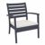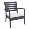 Artemis XL outdoor seating set of four dark gray club arm chairs with natural cushions and one rectangle coffee table. Modern design with simple lines. Made from commercial grade polypropylene. Club chairs stack. Casual and modern design make it suitable for indoors and outdoors. Polypropylene fame resists sun, oils, chlorine and all outdoor conditions. Great casual seating choice for outdoor areas. Chairs certified for strict European standards by CATAS Italian research institute and test laboratory.