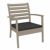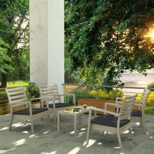 Artemis XL outdoor seating set of four taupe club arm chairs with charcoal cushions and one rectangle coffee table. Modern design with simple lines. Made from commercial grade polypropylene. Club chairs stack. Casual and modern design make it suitable for indoors and outdoors. Polypropylene fame resists sun, oils, chlorine and all outdoor conditions. Great casual seating choice for outdoor areas. Chairs certified for strict European standards by CATAS Italian research institute and test laboratory.