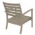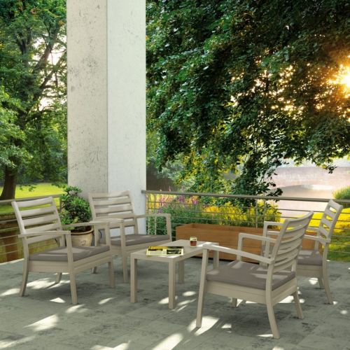 Artemis XL outdoor seating set of four taupe club arm chairs with taupe cushions and one rectangle coffee table. Modern design with simple lines. Made from commercial grade polypropylene. Club chairs stack. Casual and modern design make it suitable for indoors and outdoors. Polypropylene fame resists sun, oils, chlorine and all outdoor conditions. Great casual seating choice for outdoor areas. Chairs certified for strict European standards by CATAS Italian research institute and test laboratory.