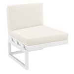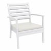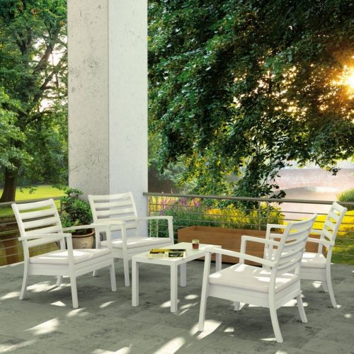 Artemis XL outdoor seating set of four white club arm chairs with natural cushions and one rectangle coffee table. Modern design with simple lines. Made from commercial grade polypropylene. Club chairs stack. Casual and modern design make it suitable for indoors and outdoors. Polypropylene fame resists sun, oils, chlorine and all outdoor conditions. Great casual seating choice for outdoor areas. Chairs certified for strict European standards by CATAS Italian research institute and test laboratory.