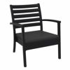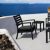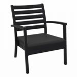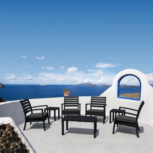 Black Artemis XL outdoor seating set with four club arm chairs, two square side tables and one rectangle coffee table with 100% acrylic charcoal cushion. Modern design with simple lines. Made from commercial grade polypropylene. Club chairs stack. Casual and modern design make it suitable for indoors and outdoors. Polypropylene fame resists sun, oils, chlorine and all outdoor conditions. Great casual seating choice for outdoor areas. Chairs certified for strict European standards by CATAS Italian research institute and test laboratory.