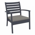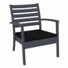 Dark Gray Artemis XL outdoor seating set with four club arm chairs, two square side tables and one rectangle coffee table with 100% acrylic black vushion. Modern design with simple lines. Made from commercial grade polypropylene. Club chairs stack. Casual and modern design make it suitable for indoors and outdoors. Polypropylene fame resists sun, oils, chlorine and all outdoor conditions. Great casual seating choice for outdoor areas. Chairs certified for strict European standards by CATAS Italian research institute and test laboratory.