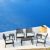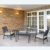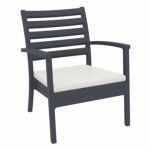 Dark Gray Artemis XL outdoor seating set with four club arm chairs, two square side tables and one rectangle coffee table with 100% acrylic natural cushion. Modern design with simple lines. Made from commercial grade polypropylene. Club chairs stack. Casual and modern design make it suitable for indoors and outdoors. Polypropylene fame resists sun, oils, chlorine and all outdoor conditions. Great casual seating choice for outdoor areas. Chairs certified for strict European standards by CATAS Italian research institute and test laboratory.