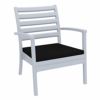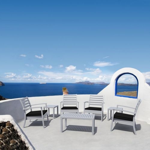 Silver Gray Artemis XL outdoor seating set with four club arm chairs, two square side tables and one rectangle coffee table with 100% acrylic black seat cushion. Modern design with simple lines. Made from commercial grade polypropylene. Club chairs stack. Casual and modern design make it suitable for indoors and outdoors. Polypropylene fame resists sun, oils, chlorine and all outdoor conditions. Great casual seating choice for outdoor areas. Chairs certified for strict European standards by CATAS Italian research institute and test laboratory.