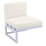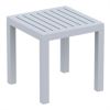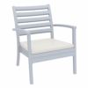 Silver Gray Artemis XL outdoor seating set with four club arm chairs, two square side tables and one rectangle coffee table with 100% acrylic natural seat cushion. Modern design with simple lines. Made from commercial grade polypropylene. Club chairs stack. Casual and modern design make it suitable for indoors and outdoors. Polypropylene fame resists sun, oils, chlorine and all outdoor conditions. Great casual seating choice for outdoor areas. Chairs certified for strict European standards by CATAS Italian research institute and test laboratory.