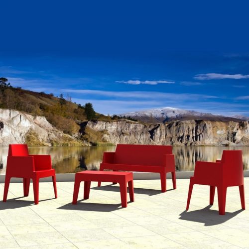Box resin outdoor seating set with one bench sofa, two club chairs and one rectangle coffee table. Box outdoor seating set features strong and stable frames with commercial grade resin polypropylene construction. All items in the set are stackable. Ideal for seasonal storage. Made from recyclable resin. Perfect for heavy use areas, patios, balconies, poolsides. Outdoor set is resistant to UV, suntan oils, saltwater and chlorine. Great pool side seating option.