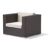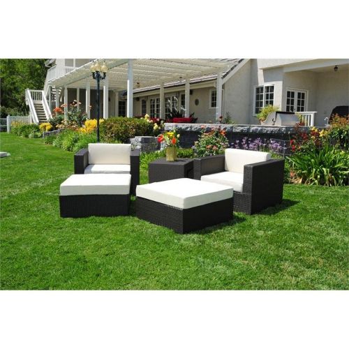 Dijon outdoor wicker club deep seating set. Patio set includes two club chairs, two ottomans and one side table. Contemporary and modern patio furniture design. Made from all weather outdoor wicker over strong extruded powder coated aluminum frame. Maintenance free. Can be washed down with water. Totally outdoor resistant. Table has a glass top. Seat and back cushions included. Wicker available in Espresso only. Cushions are 4 inch thick.