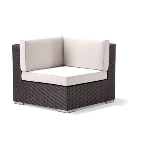 Dijon outdoor wicker deep seating corner unit. Contemporary and modern patio furniture design. Made from all weather outdoor wicker over strong extruded powder coated aluminum frame. Maintenance free. Can be washed down with water. Totally outdoor resistant. Cushions are made from 100% acrylic fabric and durable for outdoor use. Seat and back cushions included. Wicker available in Espresso only. Cushions are 4 inch thick.