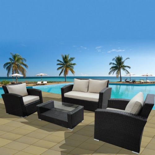 Keywest outdoor wicker deep seating set. Patio set includes two club chairs, one loveseat and one rectangle coffee table. Contemporary and modern patio furniture design. Made from all weather outdoor wicker over strong extruded powder coated aluminum frame. Maintenance free. Can be washed down with water. Totally outdoor resistant. Table has a glass top. Cushions are made from 100% acrylic fabric and durable for outdoor use. Seat and back cushions included. Wicker available in Espresso only. Cushions are 4 inch thick. Olefin cushions available in Sand color.