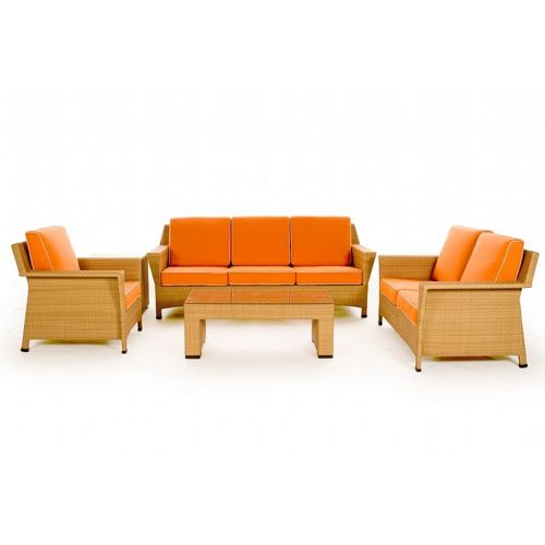 Mayan outdoor wicker club deep seating set four piece from Caluco. Large and spacy set includes one sofa, one loveseat, one club chair and one rectangle cofee table. Contemporary and modern outdoor furniture design. Made from Viro outdoor wicker over strong extruded powder coated aluminum frame. Maintenance free. Can be washed down with water. Totally outdoor resistant. Cushions are made from Sunbrella fabric and durable for outdoor use. Seat and back cushions included. Wicker available in Wheat only. Cushions are 4 inch thick.