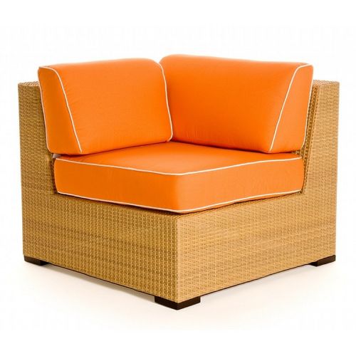 Mayan outdoor wicker sectional deep seating corner unit from Caluco. Contemporary and modern outdoor furniture design. Corner piece fits any sectional arrangement. Made from Viro outdoor wicker over strong extruded powder coated aluminum frame. Maintenance free. Can be washed down with water. Totally outdoor resistant. Cushions are made from Sunbrella fabric and durable for outdoor use. Seat and back cushions included. Wicker available in Wheat only. Cushions are 4 inch thick.
