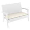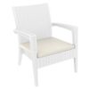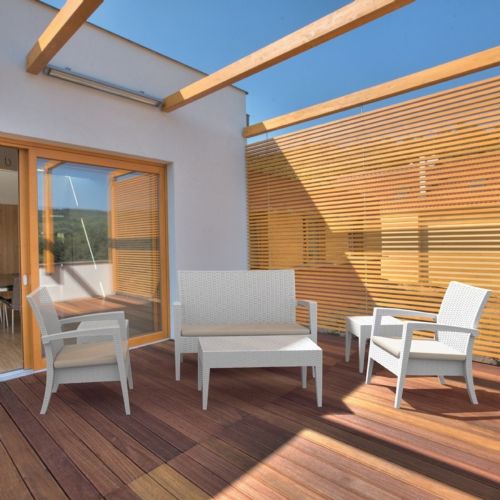 Miami white wicker looking resin patio deep seating set includes one loveseat, two club chairs, two square side tables and one coffee table. Wickerlook resin is a natural looking un-woven one piece furniture technology. Wickerlook patio furniture is made with open weave design that resembles traditional woven wicker furniture. Unlike any other woven furniture in the market Wickerlook furniture will never unravel. No moving parts that can break. Made for commercial durability. Chairs are stackable. UV treated. Hose down for cleaning. Made for outdoors. Withstands outdoor temperatures summer and winter. Chairs certified for strict European standards by CATAS Italian research institute and test laboratory.