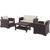 Monaco brown four piece deep seating set with a two seater loveseat sofa, two club chairs and one coffee table. Wickerlook patio furniture is made with open weave design that resembles traditional woven wicker furniture. Unlike any other woven furniture in the market this weave will never unravel. Made for commercial durability. UV treated. Hose down for cleaning. Made for outdoors. Withstands outdoor temperatures summer and winter. Certified for strict European standards by CATAS Italian research institute and test laboratory. Natural cushions included.
