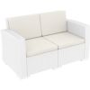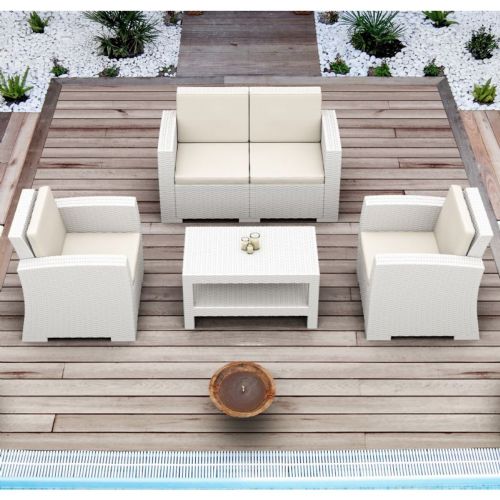 Monaco four piece deep seating set with a two seater loveseat sofa, two club chairs and one coffee table. Wickerlook patio furniture is made with open weave design that resembles traditional woven wicker furniture. Unlike any other woven furniture in the market this weave will never unravel. Made for commercial durability. UV treated. Hose down for cleaning. Made for outdoors. Withstands outdoor temperatures summer and winter. Certified for strict European standards by CATAS Italian research institute and test laboratory. Cushions included in Natural.