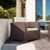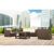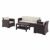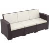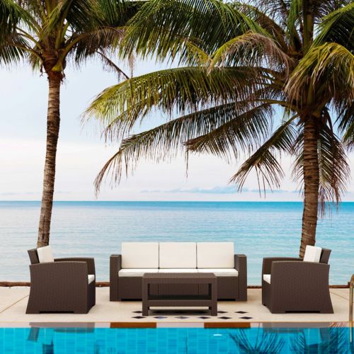 Monaco brown four piece deep seating set with a three seater sofa, two club chairs and one coffee table. Wickerlook patio furniture is made with open weave design that resembles traditional woven wicker furniture. Unlike any other woven furniture in the market this weave will never unravel. Made for commercial durability. UV treated. Hose down for cleaning. Made for outdoors. Withstands outdoor temperatures summer and winter. Certified for strict European standards by CATAS Italian research institute and test laboratory. Natural cushions included.