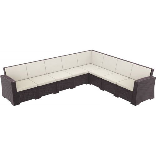 WickerLook LogoMonaco brown corner sectional with eight piece set including cushions. Sectional includes one corner, one left arm, one right arm, five middle units. Wickerlook patio furniture is made with open weave design that resembles traditional woven wicker furniture. Unlike any other woven furniture in the market this weave will never unravel. Made for commercial durability. UV treated. Hose down for cleaning. Made for outdoors. Withstands outdoor temperatures summer and winter. Certified for strict European standards by CATAS Italian research institute and test laboratory. Two person assembly required.
