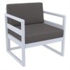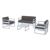 Silver Gray Mykonos lounge set with 100% acrylic charcoal cushions includes two club chairs, one loveseat and one coffee table. Modular contemporary design with commercial strength. Made from commercial grade polypropylene resin. Collection items are perfect for heavy use areas. Casual and modern design make it suitable for indoors and outdoors. Cushions are made with 100% acrylic fabric with 4 inch thick high density foam. Polypropylene frame resists sun, oils, chlorine and all outdoor conditions. Certified for strict European standards by CATAS Italian research institute and test laboratory.