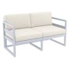 Silver Gray Mykonos lounge set with 100% acrylic natural cushions includes two club chairs, one loveseat and one coffee table. Modular contemporary design with commercial strength. Made from commercial grade polypropylene resin. Collection items are perfect for heavy use areas. Casual and modern design make it suitable for indoors and outdoors. Cushions are made with 100% acrylic fabric with 4 inch thick high density foam. Polypropylene frame resists sun, oils, chlorine and all outdoor conditions. Certified for strict European standards by CATAS Italian research institute and test laboratory.