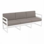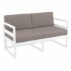 Mykonos lounge set with 100% acrylic taupe cushions includes two club chairs, one loveseat and one coffee table. Modular contemporary design with commercial strength. Made from commercial grade polypropylene resin. Collection items are perfect for heavy use areas. Casual and modern design make it suitable for indoors and outdoors. Cushions are made with 100% acrylic fabric with 4 inch thick high density foam. Polypropylene frame resists sun, oils, chlorine and all outdoor conditions. Certified for strict European standards by CATAS Italian research institute and test laboratory.