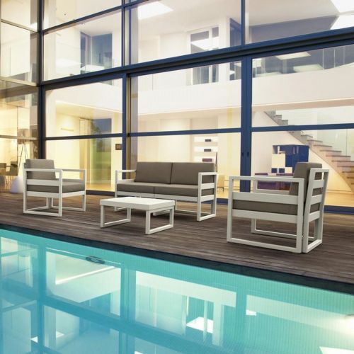 Siesta LogoMykonos lounge set with 100% acrylic taupe cushions includes two club chairs, one loveseat and one coffee table. Modular contemporary design with commercial strength. Made from commercial grade polypropylene resin. Collection items are perfect for heavy use areas. Casual and modern design make it suitable for indoors and outdoors. Cushions are made with 100% acrylic fabric with 4 inch thick high density foam. Polypropylene frame resists sun, oils, chlorine and all outdoor conditions. Certified for strict European standards by CATAS Italian research institute and test laboratory.
