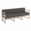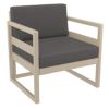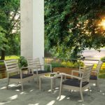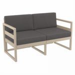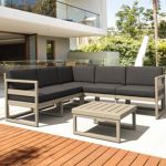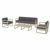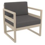 Mykonos lounge set with 100% acrylic charcoal cushions includes two club chairs, one sofa and one rectangle coffee table. Modular contemporary design with commercial strength. Made from commercial grade polypropylene resin. Collection items are perfect for heavy use areas. Casual and modern design make it suitable for indoors and outdoors. Cushions are made with 100% acrylic fabric with 4 inch thick high density foam. Polypropylene frame resists sun, oils, chlorine and all outdoor conditions. Certified for strict European standards by CATAS Italian research institute and test laboratory.