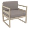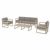 Mykonos lounge set with 100% acrylic taupe cushions includes two club chairs, one sofa and one rectangle coffee table. Modular contemporary design with commercial strength. Made from commercial grade polypropylene resin. Collection items are perfect for heavy use areas. Casual and modern design make it suitable for indoors and outdoors. Cushions are made with 100% acrylic fabric with 4 inch thick high density foam. Polypropylene frame resists sun, oils, chlorine and all outdoor conditions. Certified for strict European standards by CATAS Italian research institute and test laboratory.