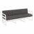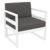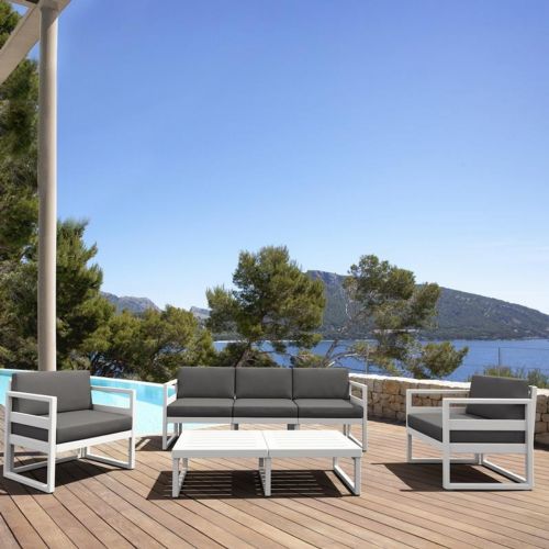 Mykonos lounge set with 100% acrylic charcoal cushions includes two club chairs, one sofa and one rectangle coffee table. Modular contemporary design with commercial strength. Made from commercial grade polypropylene resin. Collection items are perfect for heavy use areas. Casual and modern design make it suitable for indoors and outdoors. Cushions are made with 100% acrylic fabric with 4 inch thick high density foam. Polypropylene frame resists sun, oils, chlorine and all outdoor conditions. Certified for strict European standards by CATAS Italian research institute and test laboratory.