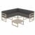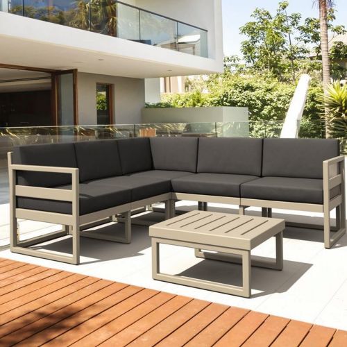 Mykonos lounge set with 100% acrylic charcoal cushions includes a five-seat corner sectional and one coffee table. Modular contemporary design with commercial strength. Made from commercial grade polypropylene resin. Collection items are perfect for heavy use areas. Casual and modern design make it suitable for indoors and outdoors. Cushions are made with 100% acrylic fabric with 4 inch thick high density foam. Polypropylene frame resists sun, oils, chlorine and all outdoor conditions. Certified for strict European standards by CATAS Italian research institute and test laboratory.