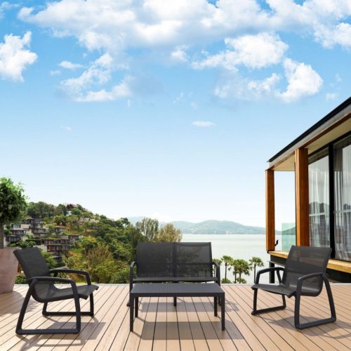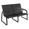 Black Pacific resort quality club lounge seating set includes two stackable club chairs, one love seat and one coffee table. Simple sleek design with commercial strength. Sling is made with Serge Ferrari mesh fabric. Very comfortable and no need for cushions. Frame made of marine grade resin polypropylene. Extremely durable and comfortable. Commercial grade.