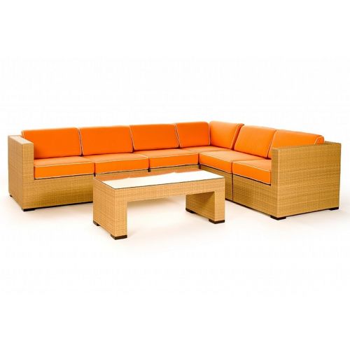 Point Dome outdoor wicker sectional deep seating set from Caluco. Set includes one corner unit, one left arm, one right arm, three middle sections and one rectangle coffee table. Contemporary and modern outdoor furniture design. Made from Viro outdoor wicker over strong extruded powder coated aluminum frame. Maintenance free. Can be washed down with water. Totally outdoor resistant. Table has a glass top. Cushions are made from Sunbrella fabric and durable for outdoor use. Seat and back cushions included. Wicker available in Wheat only. Cushions are 4 inch thick.