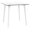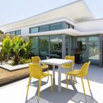 Air Maya outdoor dining set with four Air chairs and one square table. Made for commercial durability. Chairs are stackable. UV treated. Withstands outdoor temperatures summer and winter. Elegant and modern table has nonskid pads. Dining set is perfect for heavy use areas. Set items are 100% resistant to outdoors. Resin is virtually maintenance free. Table requires easy assembly.