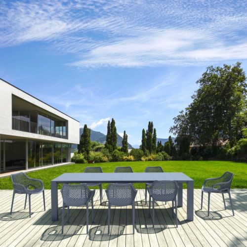 Siesta LogoDark Gray Air XL 9 piece dining set with 8 armchairs and one extension table that extends from 102 inches to 118 inches. Chairs made from 100% recyclable resin polypropylene with gas injection molded legs. For indoor and outdoor use. Table practically extendable for accommodating more guests. UV resistant. Easy cleaning. Maintenance Free. Chairs are stackable. For outdoor use.