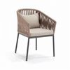 Bitta outdoor dining set with six braided chairs and one extension teak top table. Chairs are aluminum frames and braided with marine grade rope. Chair offers comfortable cushions. Marine ropes are braided to let the air through while allowing ultimate comfort. Aluminum frame is offered in manganese color. Ropes are light brown. Cushions are available in light beige. 3 inch seat cushion and back pillow included in price. Extendable table extends from 95 inches to 199 inches. Untreated natural teak top is 3 centimeters thick. Aluminum frame is offered in manganese color. Accomodates 8-10 guests. Teak top certified by Peruthami