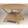 Dining set with four dining chairs and one 48 inch round dining table from Whitecraft. Offers traditional outdoor designs with an emphasis on larger pieces for added comfort. All furniture items are made with aluminum frames with powdercoating finishes woven with high density polyethylene wicker. Woven wicker mimics the natural beauty and character while providing maintenance-free and easy to clean use. Outdoor wicker will not rot, peel, fade or chip. Cushions are made with Sunbrella fabric. Table has umbrella hole.